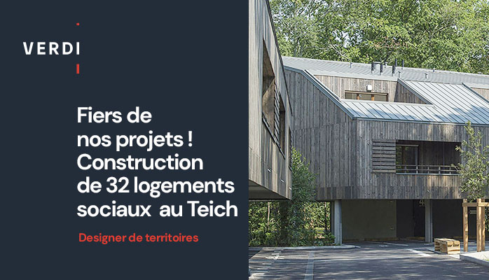 Les bâtiments sont implantés en lisière d’un EBC, à l’entrée Est du TEICH, dans la forêt de Nezer. Notre démarche a consisté à limiter au maximum l’impact visuel du bâti, en libérant notamment le rez-de-chaussée pour créer des transparences sur le cœur d’îlot boisé, et à dissocier clairement structure et enveloppe pour des raisons thermiques. En cela, planchers, refends et poteaux sont en béton alors que l’enveloppe du bâtiment entièrement continue est réalisée en bois. Le pin des menuiseries, bardages, fermetures et volets, est destiné à vieillir et se fondre dans la végétation existante