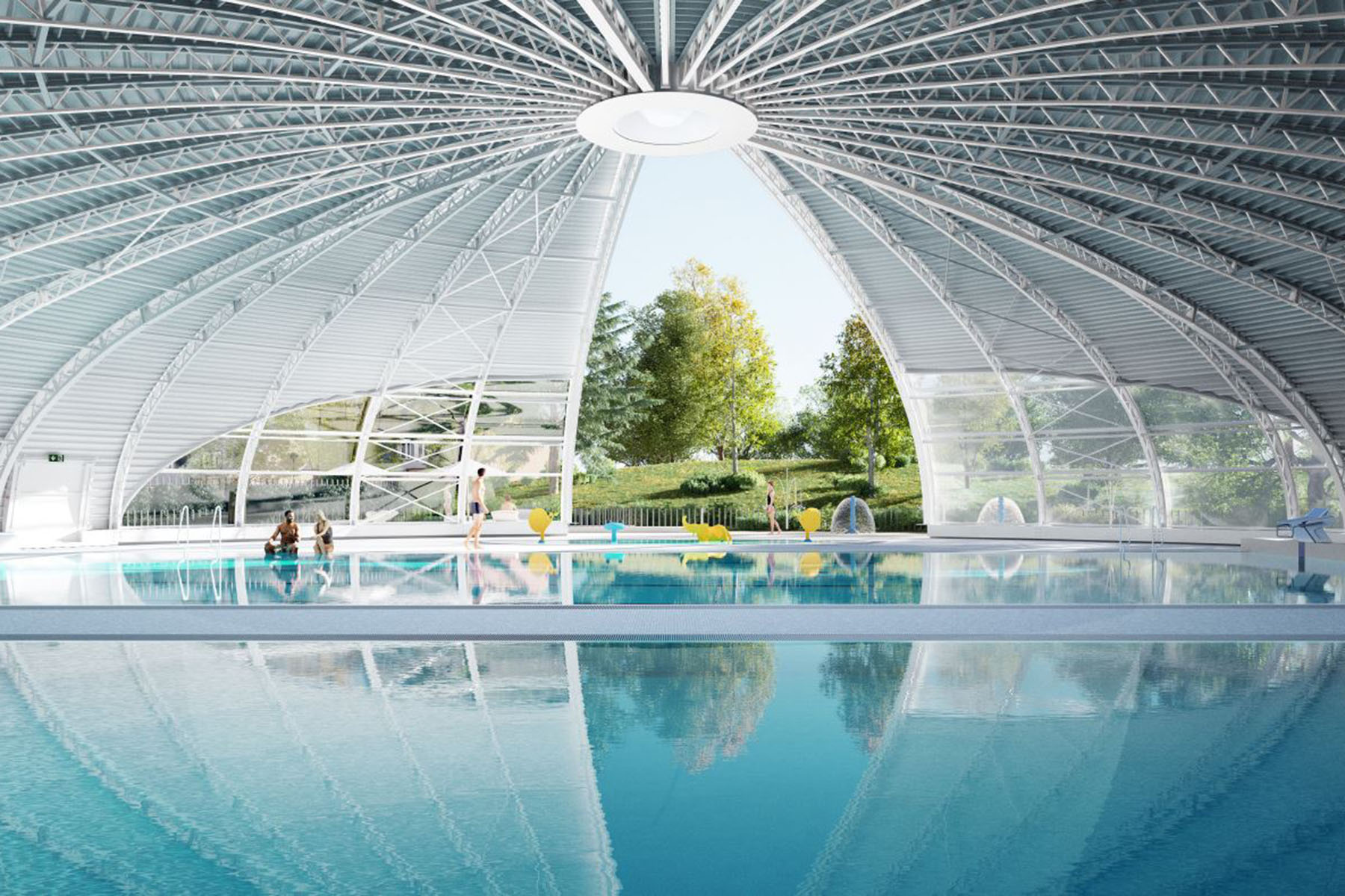 C’est un monument en voie de disparition… Sur les 183 piscines tournesol construites dans les années 70, nombre ont été démolies et rares sont celles encore en activité. La “ citrouille d’Achicourt ”, surnommée ainsi par les achicouriens en raison de sa couleur jaune-orangé, construite en 1977, nécessitait une réhabilitation complète. La coupole et sa charpente métallique de 36 arches sont conservées et valorisées. Une extension, sobre et compacte, permettra l’ajout de nouvelles fonctions : bassin d’apprentissage ; pataugeoire ; solarium ; vestiaires individuels et collectifs ; locaux administratifs… En plus du bassin actuel qui sera recouvert d’inox. Un nouveau mécanisme d’ouverture permettra à la coque de s’ouvrir généreusement sur les espaces extérieurs. Ces espaces sont conçus de manière à offrir un nouveau cadre paysager aux usagers, développant un écrin végétal avec une ambition plus écologique, à l’image d’un jardin naturel. Ce cadre paysager s’appuie sur les arbres existants, mais est complété d'une végétation multi-strates arborescentes, arbustive et herbacée, plus intéressante d’un point de vue écologique. Cela permet aussi de proposer une ambiance paysagère naturelle, en phase avec les enjeux environnementaux actuels. Le vocabulaire végétal s’inspire ainsi des essences locales intéressantes pour le développement d’une biodiversité locale.